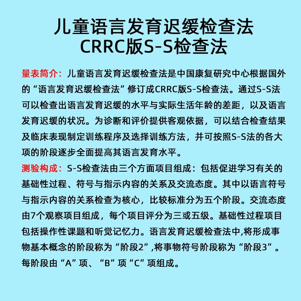 兒童語言發(fā)育遲緩檢查法是1990年中國康復(fù)研究中心根據(jù)日本語言發(fā)育遲緩委員會編制的“語言發(fā)育遲緩檢查法”修訂成CRRC版S-S檢查法(sign-significane,S-S法)。通過S-S法可以檢查出語言發(fā)育遲緩的水平與實際生活年齡的差距,以及語言發(fā)育遲緩的狀況。為診斷和評價提供客觀依據(jù),可以結(jié)合檢查結(jié)果及臨床表現(xiàn)制定訓(xùn)練程序及選擇訓(xùn)練方法,并可按照S-S法的各大項的階段逐步全面提高其語言發(fā)育水平。